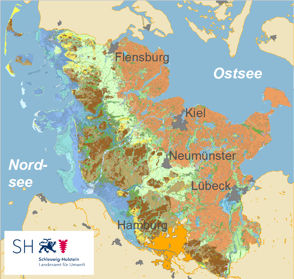 Die geologische Karte von Schleswig-Holstein 1:50.000 stellt die oberflächennahen geologischen Verhältnisse bis zwei Meter Tiefe im Land flächendeckend dar. Den im Bereich jeder abgegrenzten Fläche übereinander anstehenden Schichten werden Alter (Stratigraphie), Gesteinszusammensetzung (Lithologie) und Entstehung (Geogenese) zugeordnet. Die Symbolfarbe der Legende wird i. d. R. durch die Eigenschaften der oberen Schicht bestimmt. Die Zeichen in den Flächen stehen i. d. R. für die unterlagernde Schicht. Die Gesteine von Gewässerbetten werden nicht ausgewiesen. Wattflächen werden undifferenziert dargestellt. Die Bezeichnung der geologischen Einheiten beziehen sich auf den Symbolschlüssel Geologie. Die geogenetischen Begriffsdefinitionen gehen auf die geologische Kartieranleitung (AG Geologie) zurück. Informationen zum Symbolschlüssel und zu den Begriffsdefinitionen stehen im Internet zur Verfügung. Die Symboleinheiten der Legende entstehen durch die Vereinfachung und Zusammenfassung (Generalisierung) von Kartiereinheiten (KE), die aus bis zu vier Schichten bestehen können. Sie sind in Kurzform für jede Fläche beschrieben. Erläuterungen zu den Attributen der Flächen und die Generallegende stehen als PDF-Dateien begleitend zur Verfügung.