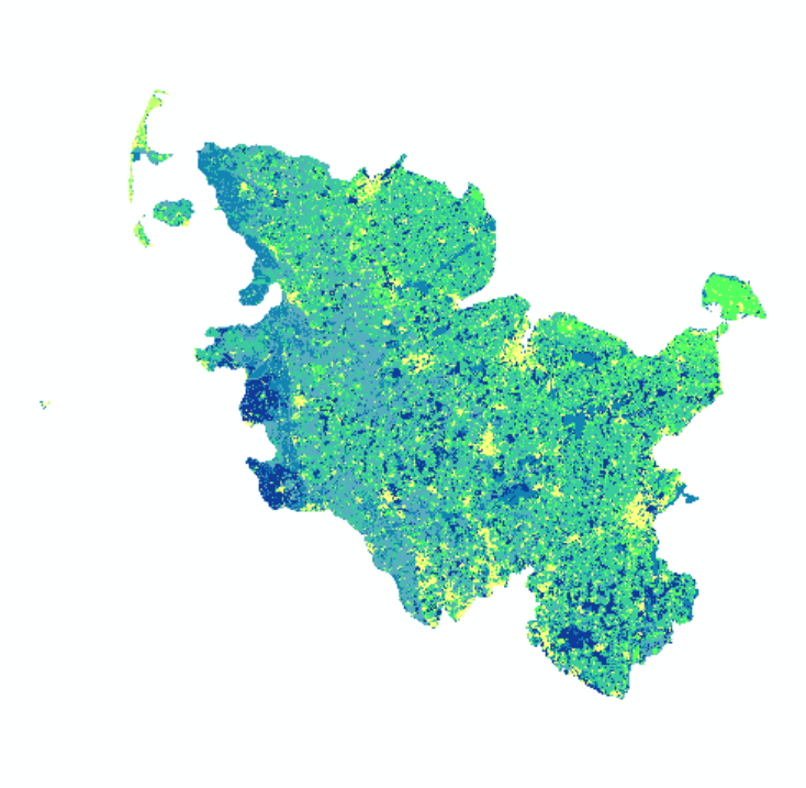 Mittlere jährliche tatsächliche Evapotranspiration (1981-2010) für Schleswig-Holstein in mm/a und mit einer räumlichen Auflösung von 100 m x 100 m. Die tatsächliche Evapotranspiration (auch als „reale Verdunstung“ bezeichnet) ist die Wassermenge, die von einem Pflanzenbestand unter natürlichen Bedingungen an die Atmosphäre abgegeben wird.