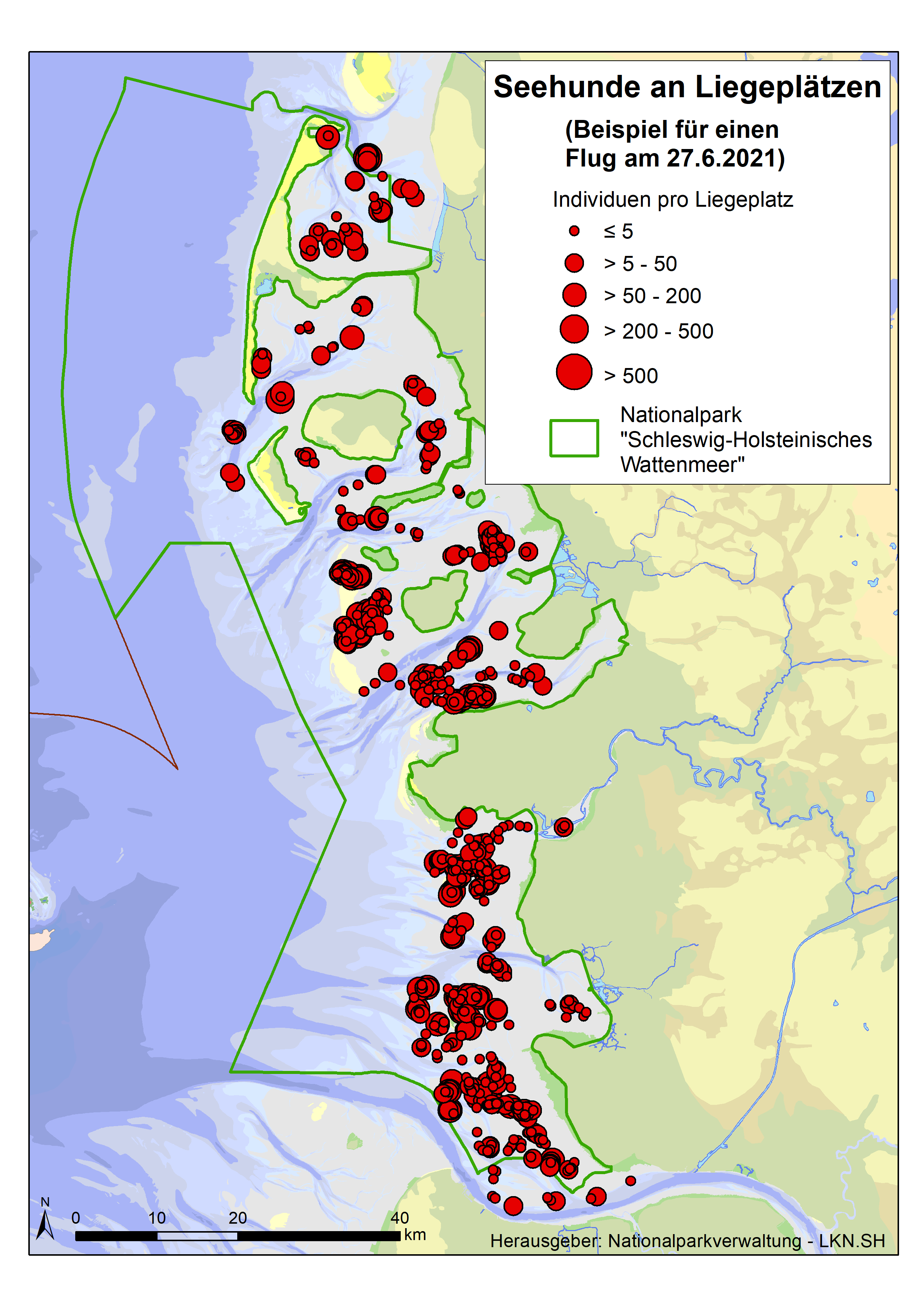 Dieser dienstbezogene Datenbestand stellt alle ab 1989 verfügbaren Seehund-Daten aus Zählflügen im Bereich des Nationalparks "Schleswig-Holsteinisches Wattenmeer" zur Verfügung. Hier handelt es sich um Daten aus flächendeckenden, flugzeuggestützten Erfassungen aus, für Seehunden relevanten Jahreszeiten, ab 1989: in der Regel werden pro Jahr zur Wurfzeit (Mai - Juli) drei und zur Haarwechselzeit (August - September) zwei Erfassungsflüge durchgeführt. Dieser Dienst liefert folgende Informationen, die zur Bestandsabschätzung nötig sind: Anzahlen von Seehunden pro Liegeplatz pro Flug und den Anteil an Jungtieren. Der hier beschriebene Datenbestand liefert alle Daten der Erfassungsflüge ab 1989. Durch einen Jahres-Filter können die Daten auf die einzelnen Erfassungsjahre eingeschränkt werden, pro Jahr werden dann alle fünf Erfassungen dargestellt. Auf Basis des Flugdatums können die Erfassungen auch einzeln dargestellt werden. Während des Monitorings wird allen gezählten Einzeltieren bzw. Gruppen eine punktgenaue Koordinate zugewiesen, die als Liegeplatz definiert ist. Wenn möglich wird bei der Zählung nach adulten und juvenilen Tieren unterschieden. Sichtungen außerhalb dieses Zeitraumes werden in diesem Datensatz nicht zur Verfügung gestellt (siehe dazu: Robben: Monitoring der Bestände von Seehunden und Kegelrobben im Schleswig-Holsteinischen Wattenmeer ab 1989.